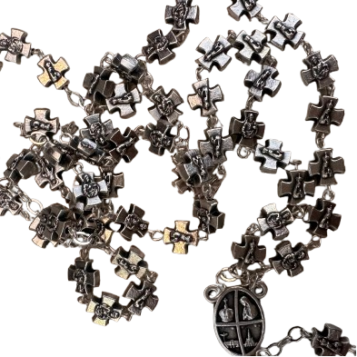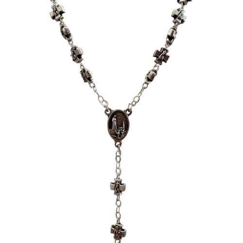 Terço em metal, em forma de cruzes, de Nossa Senhora de Fátima e Sagrado Coração de Jesus.