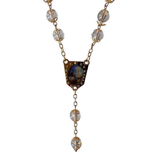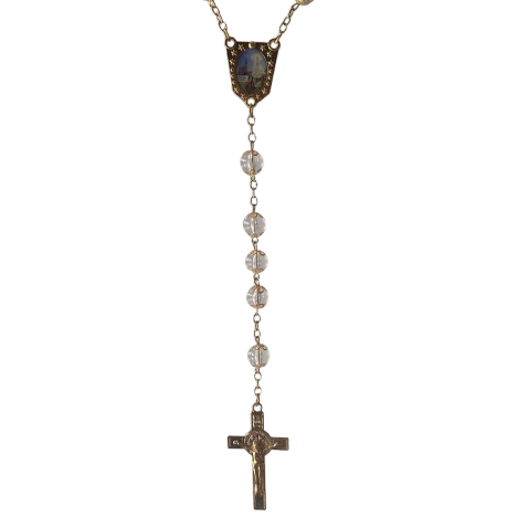 Terço de parede, em metal com Nossa Senhora de Fátima.