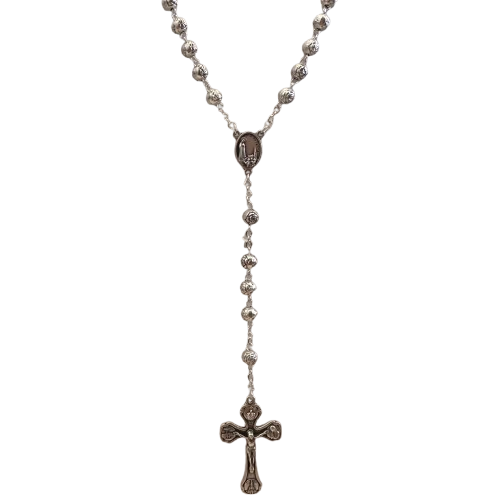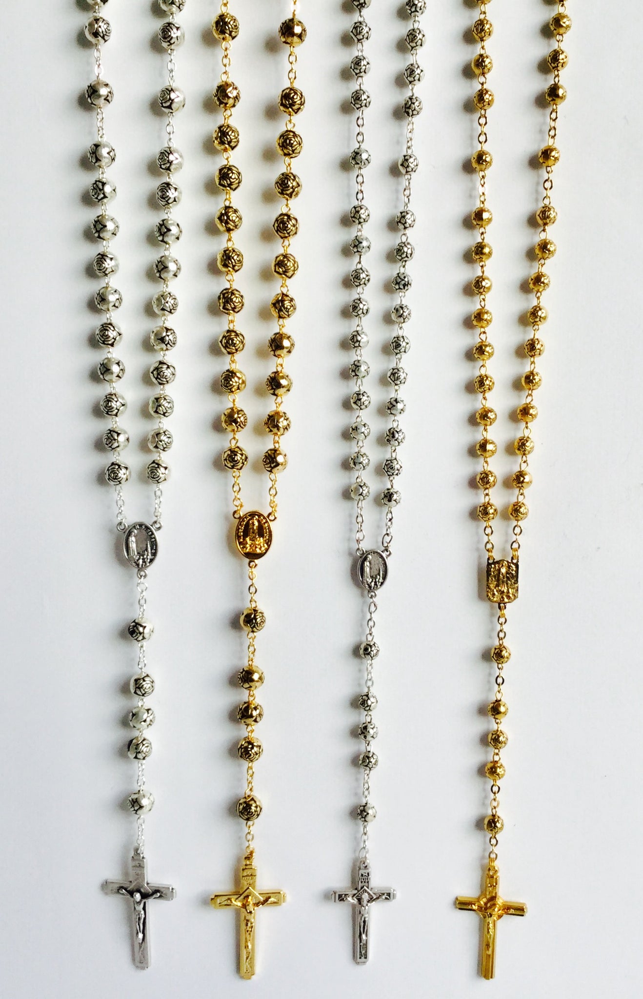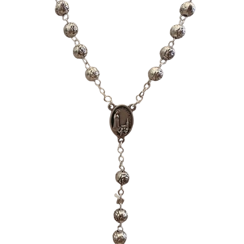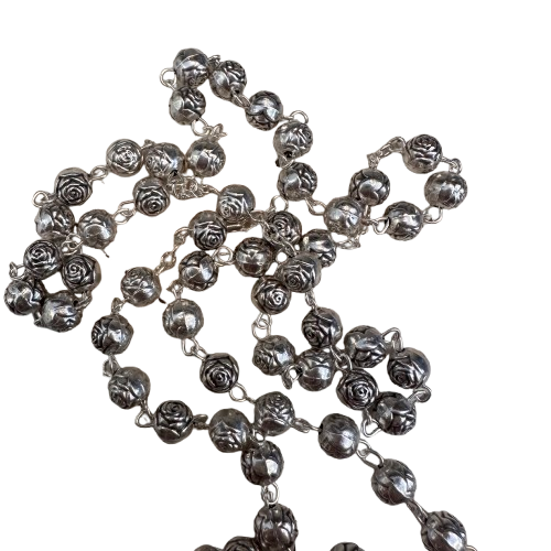 Terço em metal em forma de rosas, existe em prateado dourado e em dois tamanhos.